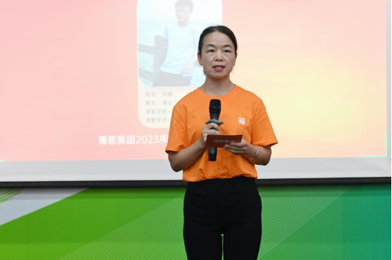本次金榜題名頒獎(jiǎng)典禮,還特別邀請(qǐng)到了劉越(福建農(nóng)林大學(xué) 碩士研究生)的家長(zhǎng)——馬良贏(佛山工廠綜合部綜合員,2023最美播恩人)作為家長(zhǎng)代表發(fā)言。她首先對(duì)集團(tuán)一直以來(lái)提供的高水平員工福利表示衷心的感謝,從本次金榜題名活動(dòng)中,她也感受到深深的員工關(guān)懷。她十分感謝集團(tuán)提供了這樣一個(gè)和大家分享喜悅的機(jī)會(huì),并表示以后會(huì)更加珍惜自己的工作崗位,努力做更優(yōu)秀的播恩人,努力培養(yǎng)孩子成長(zhǎng)成材,最后祝集團(tuán)發(fā)展越來(lái)越好,未來(lái)蒸蒸日上。