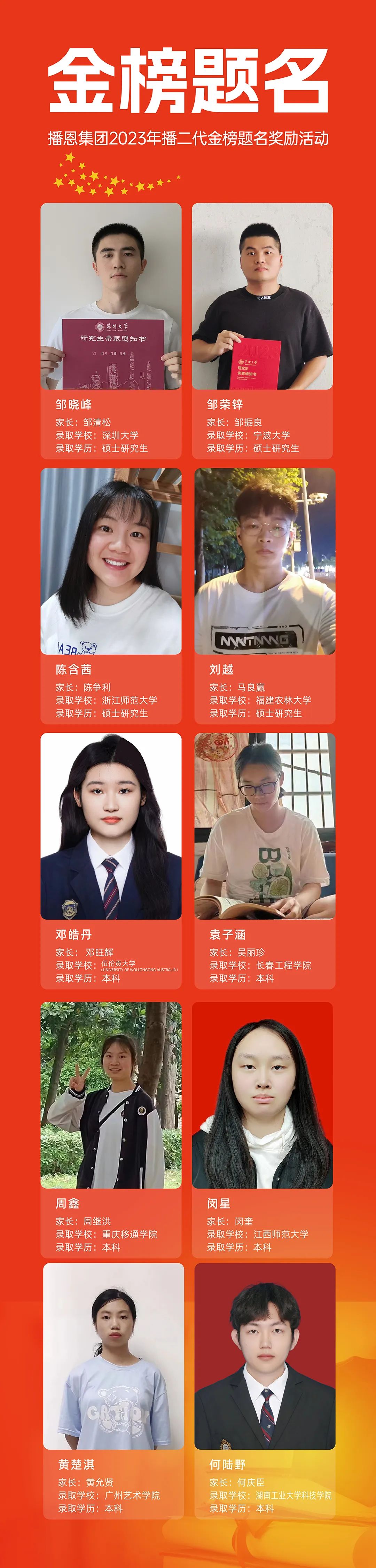 2023年集團(tuán)職工子女有10人考入高校,其中碩士4人,本科6人。為鼓勵(lì)更多的“播二代們”成為有理想、有行動(dòng)、有擔(dān)當(dāng)?shù)那嗄辏瑫r(shí)也給職工帶來(lái)滿(mǎn)滿(mǎn)的歸屬感與榮耀感,集團(tuán)除了現(xiàn)金獎(jiǎng)勵(lì)外,還送上了董事長(zhǎng)鄒新華先生的祝賀函、自著的《百煉成王—王陽(yáng)明》一書(shū)、精美禮品等。我們也對(duì)其中一些具有代表性的家長(zhǎng)進(jìn)行了采訪(fǎng),下面是他們的一些采訪(fǎng)紀(jì)實(shí)。