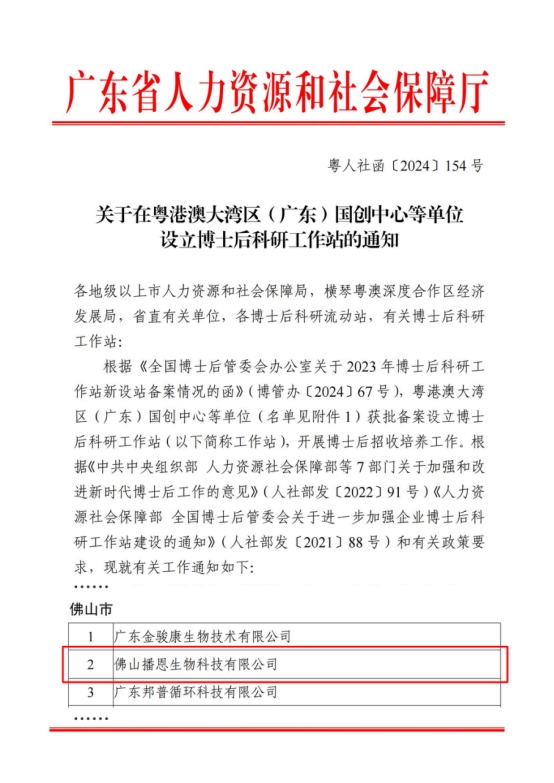 近日,廣東省人力資源和社會(huì)保障局印發(fā)了《關(guān)于在粵港澳大灣區(qū)(廣東)國(guó)創(chuàng)中心等單位設(shè)立博士后科研工作站的通知》(粵人社函〔2024〕154號(hào)),佛山播恩生物科技有限公司成功獲批設(shè)立國(guó)家級(jí)博士后科研工作站。這一榮譽(yù)標(biāo)志著佛山播恩在高層次人才培養(yǎng)、科研創(chuàng)新及產(chǎn)學(xué)研合作方面邁出了堅(jiān)實(shí)的一步,為企業(yè)未來發(fā)展注入了強(qiáng)勁動(dòng)力。