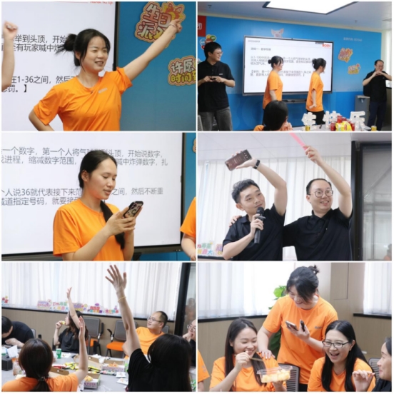 致辭結(jié)束后,生日會進入互動環(huán)節(jié),現(xiàn)場也瞬間化作歡樂的海洋。美食香氣四溢間,各類趣味游戲輪番登場,徹底打破了平日里的工作嚴肅氛圍。在“表情包猜成語”環(huán)節(jié),技術(shù)人員一改往日專注敲代碼的沉穩(wěn)模樣,為了搶答成功,快速高舉手臂,甚至踮起腳尖,躍躍欲試的模樣引得全場笑聲不斷。最令人驚喜的當屬法務(wù)和審計部門的“跨界表演”。這些平日里嚴謹認真、專注于合同條款與數(shù)據(jù)表格的同事們,被青春洋溢的播恩學(xué)妹熱情邀請,臨時上陣挑戰(zhàn)《愛你》舞蹈。沒有排練、毫無經(jīng)驗的他們,動作有的快半拍、有的慢半拍,甚至手腳“各自為政”,但卻絲毫不怯場,努力跟上節(jié)奏的認真模樣,搭配著略顯笨拙的舞步,讓現(xiàn)場充滿歡樂的氣氛,歡呼聲與掌聲此起彼伏……一個個游戲,一個個互動,笑聲與音樂聲交織,繪就出一幅溫暖而熱烈的團隊情誼畫卷。